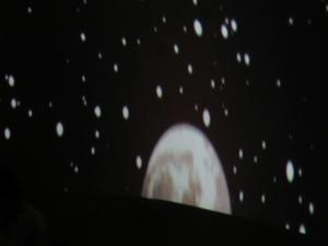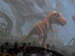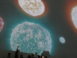 Guruplar halinde küresel çadıra alınan öğrenciler üç boyutlu uzay görüntülerini ve ilk çağ yaşamını ilgi ve heyecanla izlerken hayret nidaları atıyorlar.