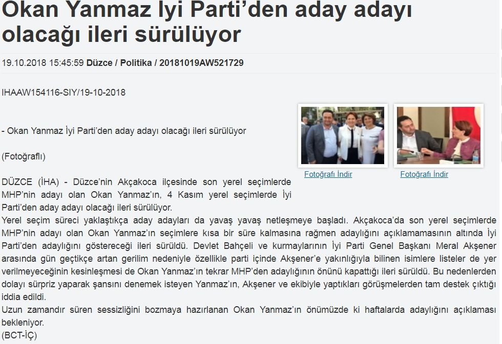 2019 Martında yapılacak Yerel Seçimlerde Akçakoca’da MHP den aday olacağına kesin gözüyle bakılan Okan Yanmaz ile ilgili bugün İhlas Haber Ajansı tarafından saat 15: 45’te abonelerine geçilen “ Okan Yanmaz İyi Parti’den aday adayı olacağı ileri sürülüyor “ haberine, Okan Yanmaz sert tepki gösterdi.