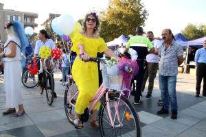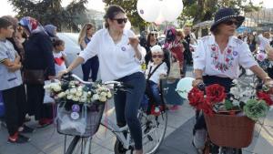 Düzce’de Süslü Kadınlar adıyla anılan kadınlar 63 ille birlikte eş zamanlı olarak bisikletlerine binerek pedal çevirdiler.